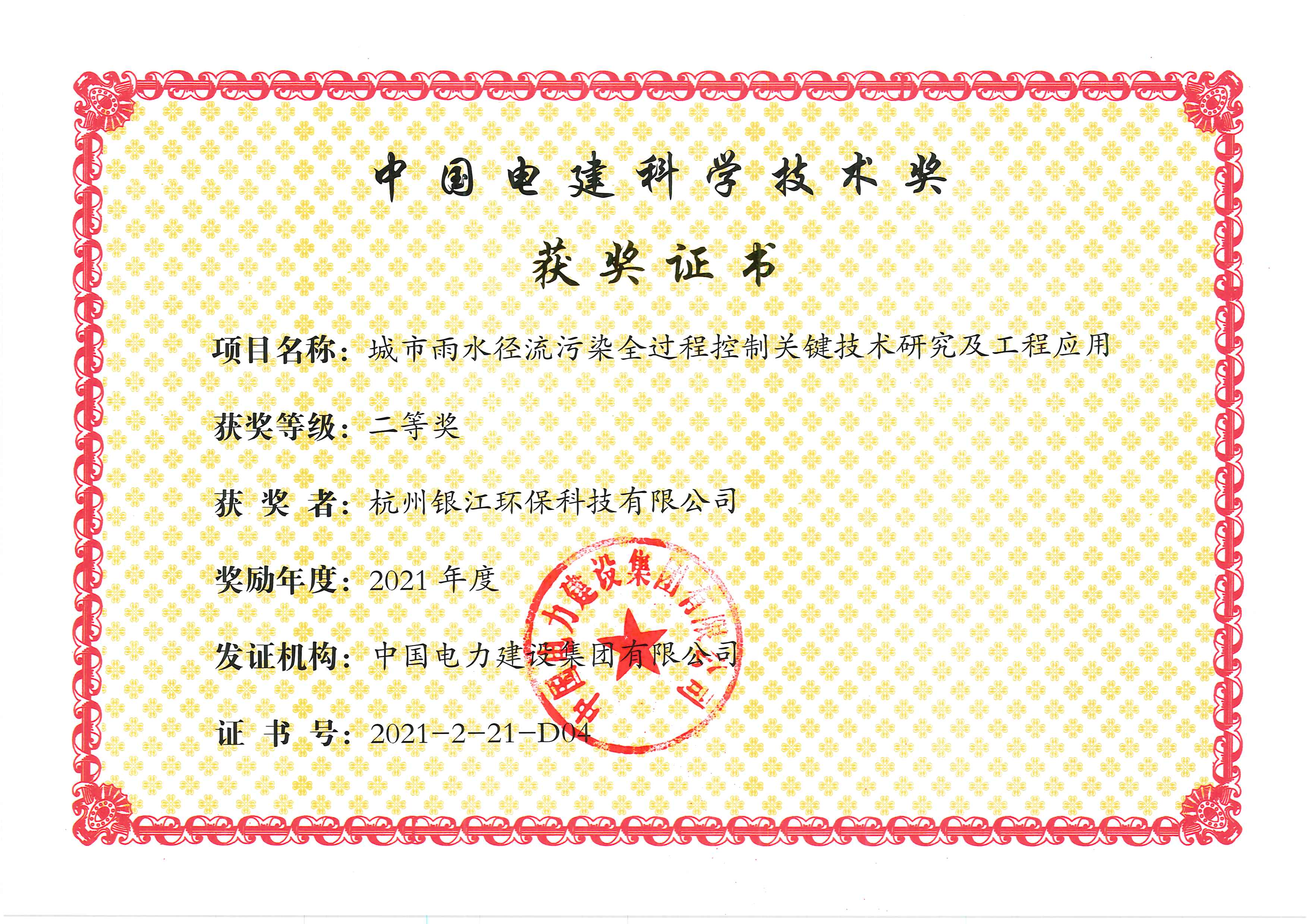 銀江環(huán)保《城市雨水徑流污染全過程控制關鍵技術(shù)研究及工程應用》獲中國電建科學技術(shù)二等獎。