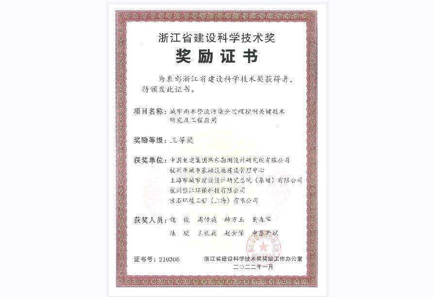 銀江環(huán)保《城市雨水徑流污染全過程控制關鍵技術(shù)研究及工程應用》獲浙江省建設科學技術(shù)三等獎。