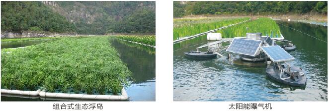 水源地保護(hù)、湖泊水體綜合治理采用組合生態(tài)浮島(專利)加太陽(yáng)能曝氣(專利)技術(shù)。