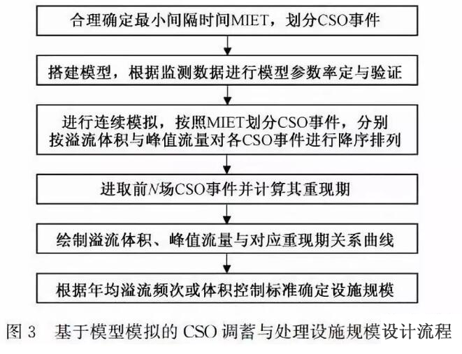合流制排水管渠系統的溢流特征受降雨特征、匯水區域大小、用地情況、截流干管和污水處理廠運行工況等條件影響,較為復雜。實際運行中,CSO結束的時間會滯后于降雨,降雨強度峰值前后、峰值之間往往不發生CSO,導致經常出現溢流的間斷時間長于降雨事件間隔時間的情況,此時,按照一場降雨最多產生一次CSO事件的原則,用于劃分CSO事件的MIET取值會大于用于劃分降雨事件的MIET,具體取值大小應根據不同項目條件做具體分析,也可根據大量工程建設及運行經驗統一確定適用于本地區CSO事件劃分的MIET,如美國華盛頓州的CSO事件的MIET取值為24 h(大于降雨事件的MIET=18 h)。從CSO控制系統的協調運行角度考慮,CSO事件的MIET確定還與CSO調蓄設施的排空時間、處理設施的處理能力等相關。綜上,基于模型模擬的CSO調蓄與處理設施規模設計流程如圖3所示。