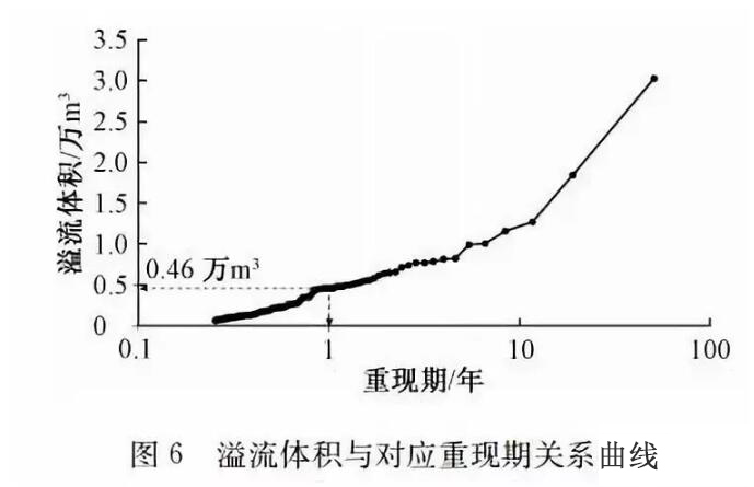 根據表1,建立溢流體積與對應重現期關系曲線,如圖6所示,1次/年、2次/年、3次/年、4次/年的年均溢流頻次控制標準對應的溢流體積分別為0.46萬m3、0.21萬m3、0.11萬m3、0.07萬m3。若將其初步作為相應年均溢流頻次控制標準下的CSO調蓄池設計池容,經校核,對應的年均溢流體積控制率可分別達到77%、53%、37%、27%。