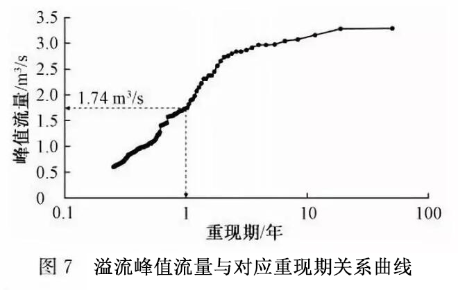 參照上述方法,可得到溢流峰值流量與對應重現期關系曲線如圖7所示,1次/年、2次/年、3次/年、4次/年對應的溢流峰值流量分別為1.74 m3/s、1.05 m3/s、0.83 m3/s、0.60 m3/s,可用于CSO調蓄池設計進水流量(可據此進一步確定進水管管徑)和CSO處理站/廠的設計最大處理流量的設計。