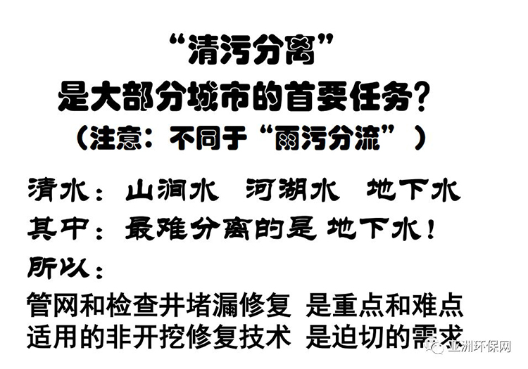 “清水包括山澗水、河湖水、地下水。檢測(cè)證明,大量是從管網(wǎng)漏進(jìn)來(lái)的。特別是地下水,量大面廣最難分離,因此,管網(wǎng)和檢查井堵漏修復(fù)是重點(diǎn)和難點(diǎn),對(duì)適用的非開(kāi)挖修復(fù)技術(shù)需求迫切?!睆垚偙硎荆瑢?duì)于地下水必須真刀實(shí)槍下功夫。不能做躲了這一代,難題留給下一代的事兒。