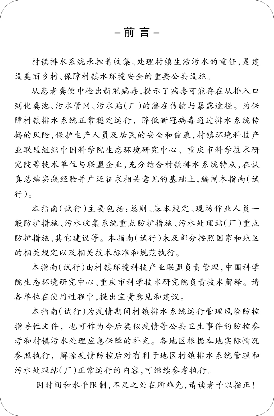 為了更好地指導(dǎo)村鎮(zhèn)污水處理領(lǐng)域的各參與主體科學(xué)管理、有效防控,保障村鎮(zhèn)排水系統(tǒng)正常穩(wěn)定運(yùn)行,降低疫情期間病毒通過排水系統(tǒng)傳播風(fēng)險(xiǎn),保障生產(chǎn)人員及居民的安全和健康,由中國科學(xué)院生態(tài)環(huán)境研究中心、村鎮(zhèn)環(huán)境科技產(chǎn)業(yè)聯(lián)盟、重慶市科學(xué)技術(shù)研究院主編,銀江環(huán)保應(yīng)邀參編的《疫情期間村鎮(zhèn)排水系統(tǒng)運(yùn)行管理風(fēng)險(xiǎn)防控工作指南》(試行)(以下簡稱“《指南》”)于3月23日正式發(fā)布。