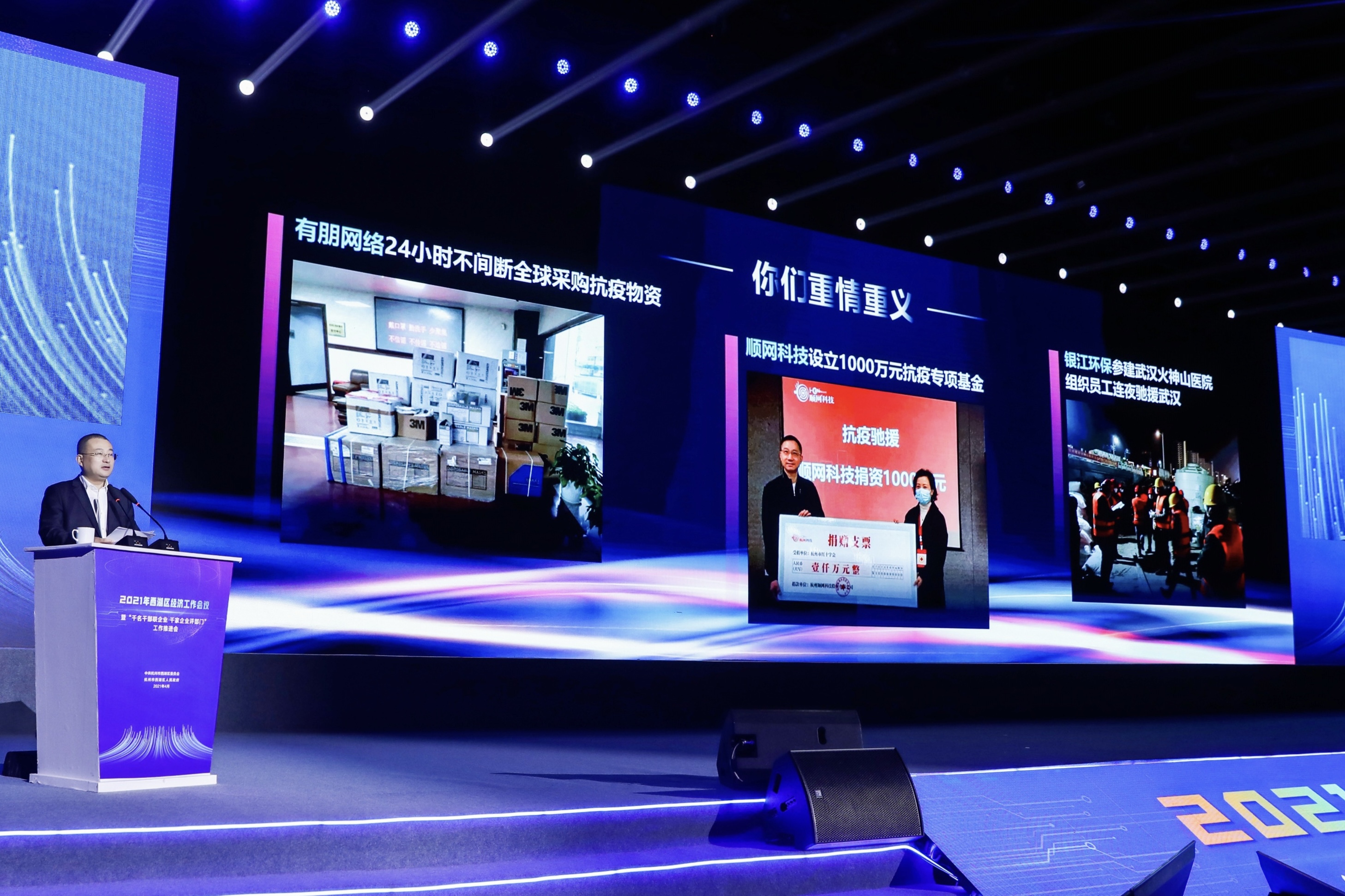 區委書記高國飛在會上發表了重要講話,對2020年的區經濟工作進行了回顧,對取得的成績表示肯定。其中,對銀江環保參建武漢火神山雷神山醫院,組織員工連夜馳援武漢的抗疫先進事跡進行了表彰。